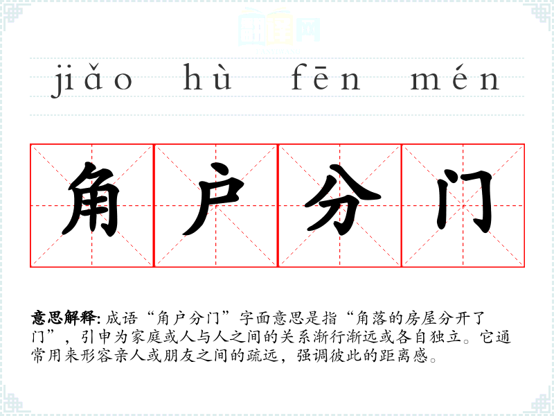 成语“角户分门”字面意思是指“角落的房屋分开了门”,引申为家庭或人与人之间的关系渐行渐远或各自独立。它通常用来形容亲人或朋友之间的疏远,强调彼此的距离感。