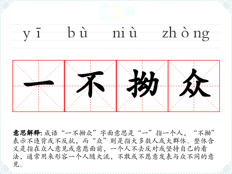 成语“一不拗众”字面意思是“一”指一个人,“不拗”表示不违背或不反抗,而“众”则是指大多数人或大群体。整体含义是指在众人意见或意愿面前,一个人不去反对或坚持自己的看法,通常用来形容一个人随大流,不敢或不愿意发表与众不同的意见。
