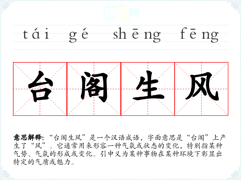 “台阁生风”这个成语的出处可以追溯到古代文学,尤其是与官场文化、文人雅士相关的作品。虽然具体的历史典故较为模糊,但可以推测其与古代的文人聚会、诗词歌赋创作时的气氛有关,象征着一种文化氛围的形成与升华。