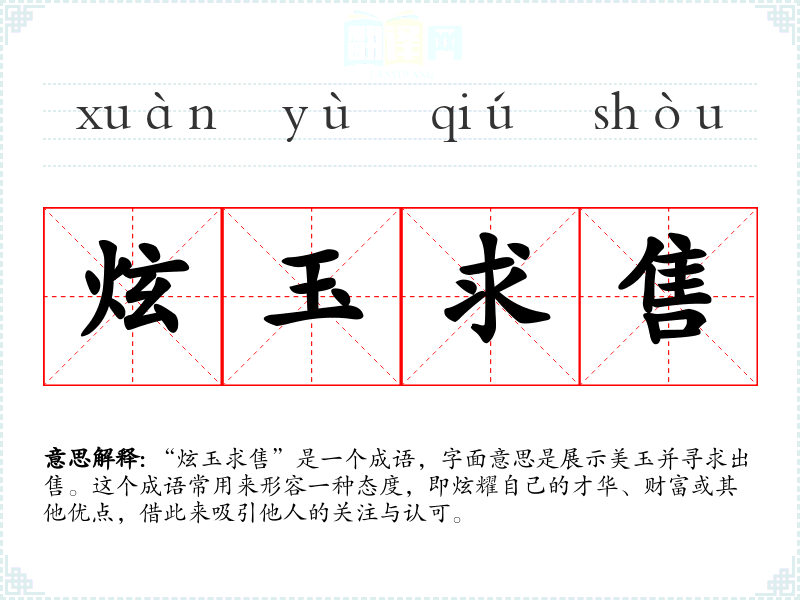 “炫玉求售”是一个成语,字面意思是展示美玉并寻求出售。这个成语常用来形容一种态度,即炫耀自己的才华、财富或其他优点,借此来吸引他人的关注与认可。