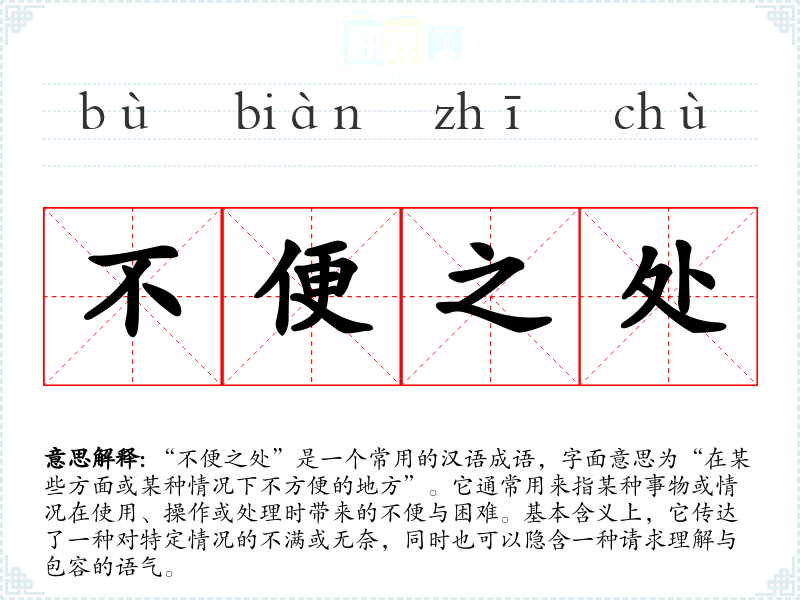 “不便之处”并不是传统意义上的成语,而更像是一个常用的表达。它的构成是由“不便”和“之处”组成,表达了在特定情况下的不便之处。虽然没有明确的文献出处,但在现代汉语中已经广泛使用,尤其是在商务、社交等场合。