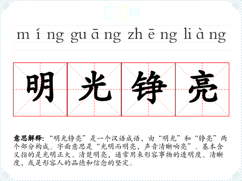 “明光铮亮”是一个汉语成语,由“明光”和“铮亮”两个部分构成。字面意思是“光明而明亮,声音清晰响亮”。基本含义指的是光明正大、清楚明亮,通常用来形容事物的透明度、清晰度,或是形容人的品德和信念的坚定。