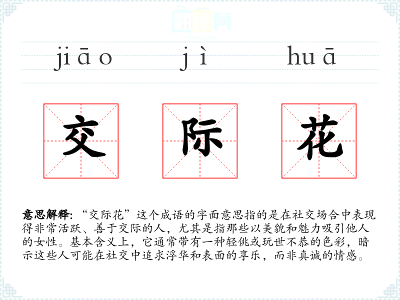 “交际花”这个成语的字面意思指的是在社交场合中表现得非常活跃、善于交际的人,尤其是指那些以美貌和魅力吸引他人的女性。基本含义上,它通常带有一种轻佻或玩世不恭的色彩,暗示这些人可能在社交中追求浮华和表面的享乐,而非真诚的情感。