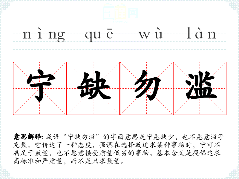 成语“宁缺勿滥”的字面意思是宁愿缺少,也不愿意滥竽充数。它传达了一种态度,强调在选择或追求某种事物时,宁可不满足于数量,也不愿意接受质量低劣的事物。基本含义是提倡追求高标准和严质量,而不是只求数量。