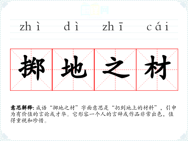 成语“掷地之材”字面意思是“扔到地上的材料”,引申为有价值的言论或才华。它形容一个人的言辞或作品非常出色,值得重视和珍惜。