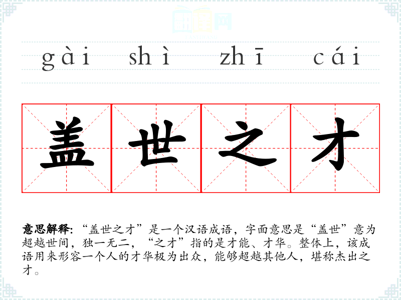 “盖世之才”可以追溯到古代文献,通常用来赞美那些在某一领域具有卓越才能的人物。虽然具体的出处较少,但在许多古代诗文中,类似的表达用来形容英雄豪杰或智者。它体现了古人对才华的崇敬与推崇,使得这一成语逐渐被广泛使用。