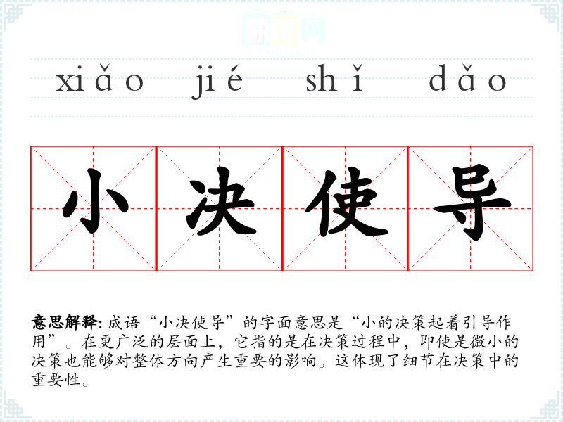 成语“小决使导”的字面意思是“小的决策起着引导作用”。在更广泛的层面上,它指的是在决策过程中,即使是微小的决策也能够对整体方向产生重要的影响。这体现了细节在决策中的重要性。