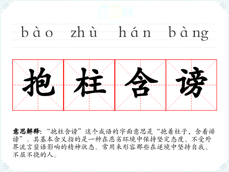 “抱柱含谤”这个成语的字面意思是“抱着柱子,含着诽谤”。其基本含义指的是一种在恶劣环境中保持坚定态度、不受外界流言蜚语影响的精神状态。常用来形容那些在逆境中坚持自我、不屈不挠的人。