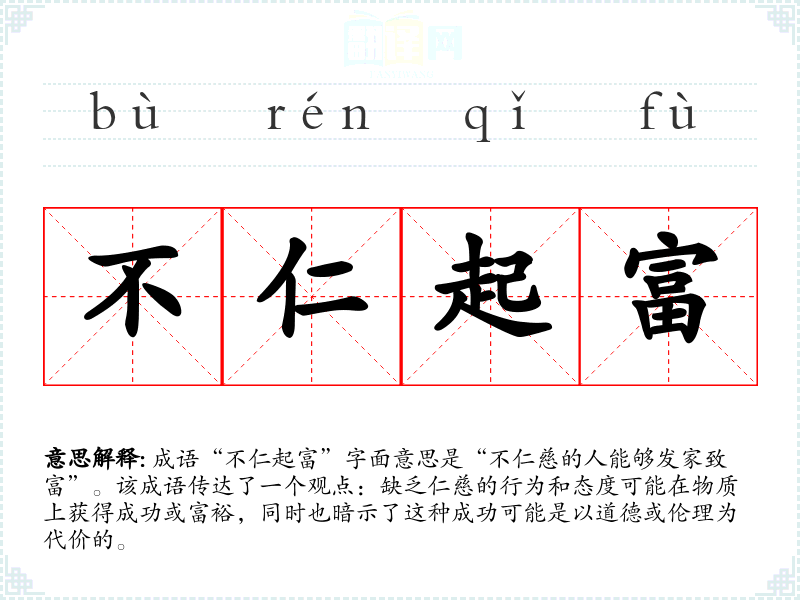 成语“不仁起富”字面意思是“不仁慈的人能够发家致富”。该成语传达了一个观点:缺乏仁慈的行为和态度可能在物质上获得成功或富裕,同时也暗示了这种成功可能是以道德或伦理为代价的。