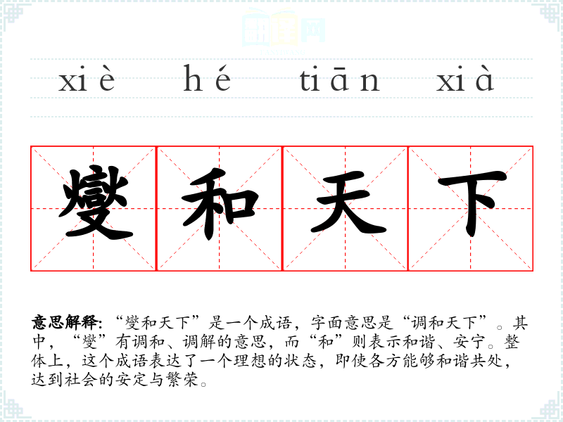 “燮和天下”是一个成语,字面意思是“调和天下”。其中,“燮”有调和、调解的意思,而“和”则表示和谐、安宁。整体上,这个成语表达了一个理想的状态,即使各方能够和谐共处,达到社会的安定与繁荣。