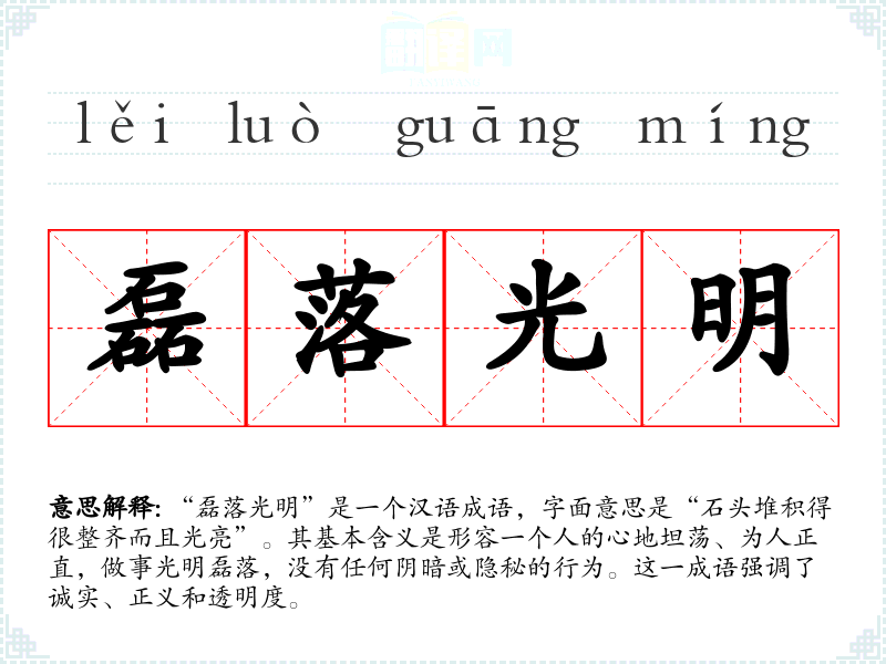 “磊落光明”是一个汉语成语,字面意思是“石头堆积得很整齐而且光亮”。其基本含义是形容一个人的心地坦荡、为人正直,做事光明磊落,没有任何阴暗或隐秘的行为。这一成语强调了诚实、正义和透明度。