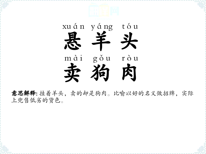 挂着羊头,卖的却是狗肉。比喻以好的名义做招牌,实际上兜售低劣的货色。