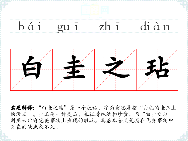 “白圭之玷”是一个成语,字面意思是指“白色的圭玉上的污点”。圭玉是一种美玉,象征着纯洁和珍贵,而“白圭之玷”则用来比喻完美事物上出现的瑕疵。其基本含义是指在优秀事物中存在的缺点或不足。