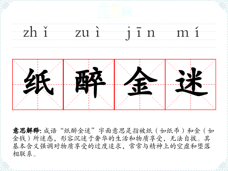 成语“纸醉金迷”字面意思是指被纸(如纸币)和金(如金钱)所迷惑,形容沉迷于奢华的生活和物质享受,无法自拔。其基本含义强调对物质享受的过度追求,常常与精神上的空虚和堕落相联系。