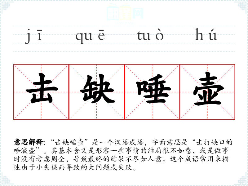 “击缺唾壶”是一个汉语成语,字面意思是“击打缺口的唾液壶”。其基本含义是形容一些事情的结局很不如意,或是做事时没有考虑周全,导致最终的结果不尽如人意。这个成语常用来描述由于小失误而导致的大问题或失败。