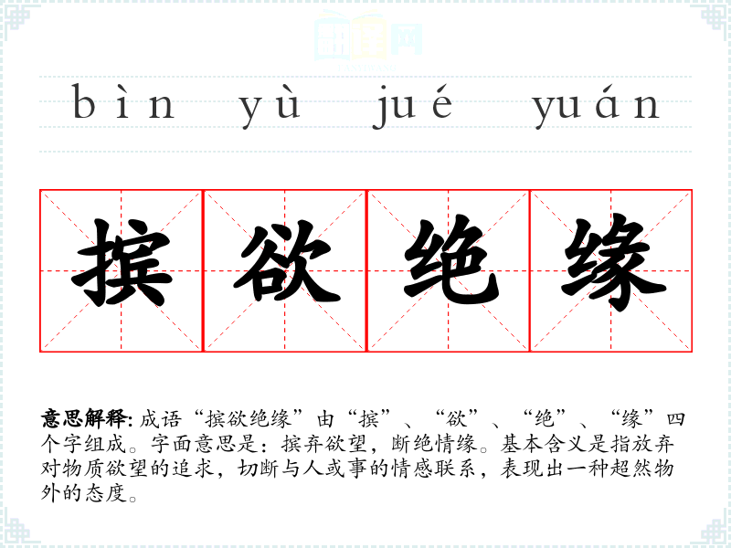 成语“摈欲绝缘”由“摈”、“欲”、“绝”、“缘”四个字组成。字面意思是:摈弃欲望,断绝情缘。基本含义是指放弃对物质欲望的追求,切断与人或事的情感联系,表现出一种超然物外的态度。