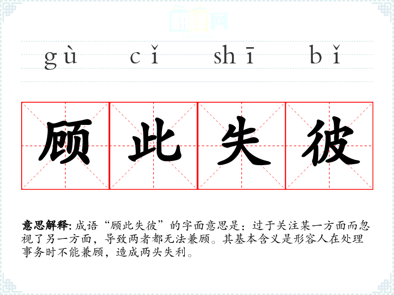 成语“顾此失彼”的字面意思是:过于关注某一方面而忽视了另一方面,导致两者都无法兼顾。其基本含义是形容人在处理事务时不能兼顾,造成两头失利。