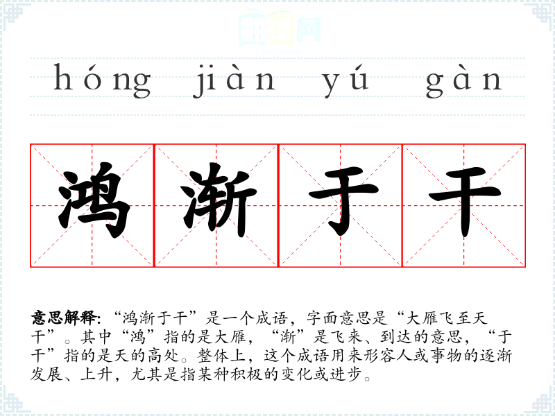 “鸿渐于干”是一个成语,字面意思是“大雁飞至天干”。其中“鸿”指的是大雁,“渐”是飞来、到达的意思,“于干”指的是天的高处。整体上,这个成语用来形容人或事物的逐渐发展、上升,尤其是指某种积极的变化或进步。