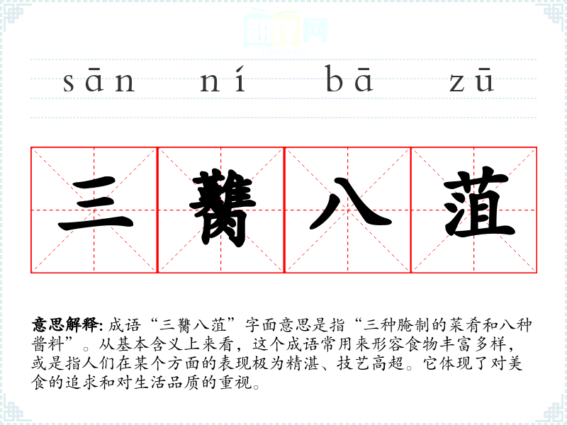 成语“三臡八菹”字面意思是指“三种腌制的菜肴和八种酱料”。从基本含义上来看,这个成语常用来形容食物丰富多样,或是指人们在某个方面的表现极为精湛、技艺高超。它体现了对美食的追求和对生活品质的重视。