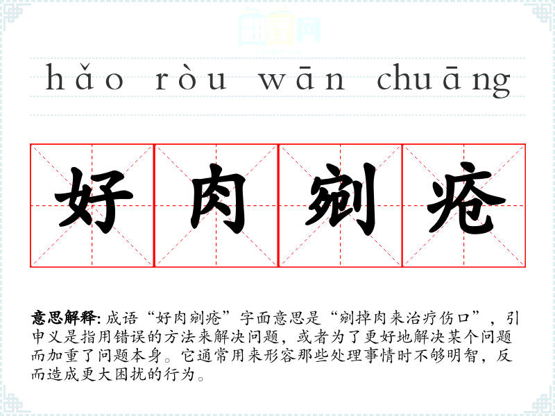 成语“好肉剜疮”字面意思是“剜掉肉来治疗伤口”,引申义是指用错误的方法来解决问题,或者为了更好地解决某个问题而加重了问题本身。它通常用来形容那些处理事情时不够明智,反而造成更大困扰的行为。