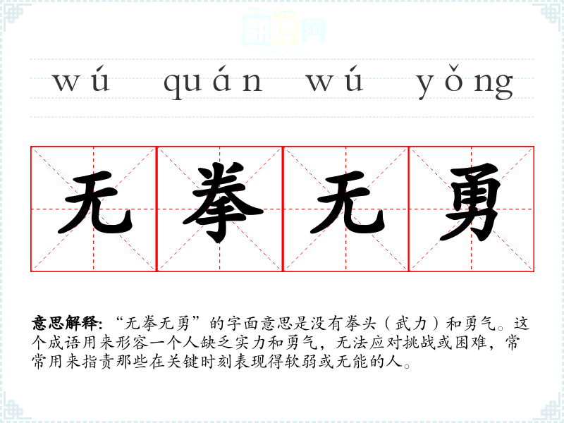 “无拳无勇”的字面意思是没有拳头(武力)和勇气。这个成语用来形容一个人缺乏实力和勇气,无法应对挑战或困难,常常用来指责那些在关键时刻表现得软弱或无能的人。