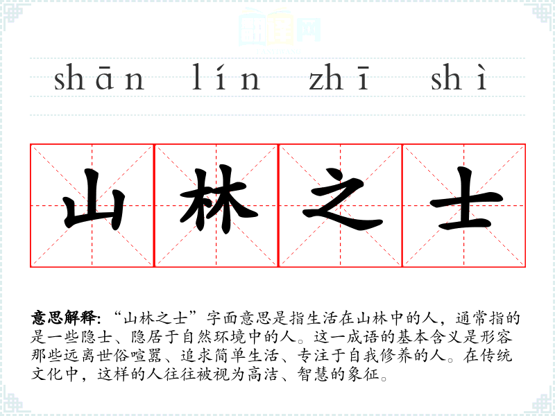 “山林之士”字面意思是指生活在山林中的人,通常指的是一些隐士、隐居于自然环境中的人。这一成语的基本含义是形容那些远离世俗喧嚣、追求简单生活、专注于自我修养的人。在传统文化中,这样的人往往被视为高洁、智慧的象征。