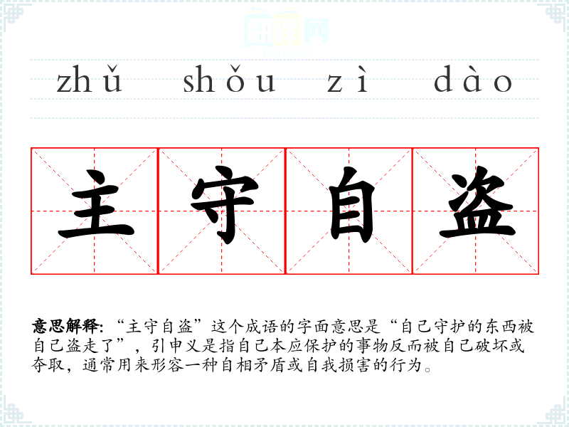 “主守自盗”这个成语的字面意思是“自己守护的东西被自己盗走了”,引申义是指自己本应保护的事物反而被自己破坏或夺取,通常用来形容一种自相矛盾或自我损害的行为。