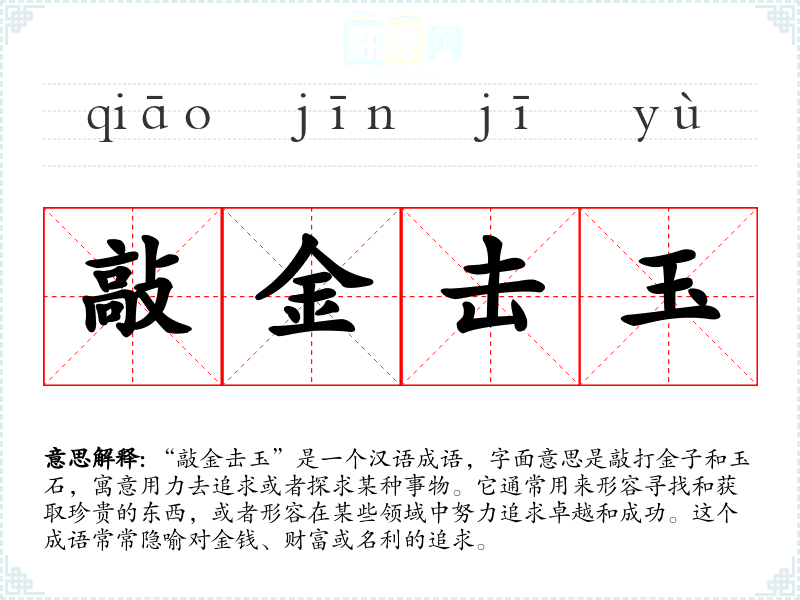 “敲金击玉”是一个汉语成语,字面意思是敲打金子和玉石,寓意用力去追求或者探求某种事物。它通常用来形容寻找和获取珍贵的东西,或者形容在某些领域中努力追求卓越和成功。这个成语常常隐喻对金钱、财富或名利的追求。