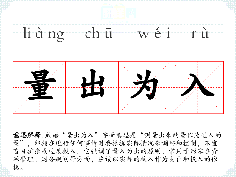 成语“量出为入”字面意思是“测量出来的量作为进入的量”,即指在进行任何事情时要根据实际情况来调整和控制,不宜盲目扩张或过度投入。它强调了量入为出的原则,常用于形容在资源管理、财务规划等方面,应该以实际的收入作为支出和投入的依据。