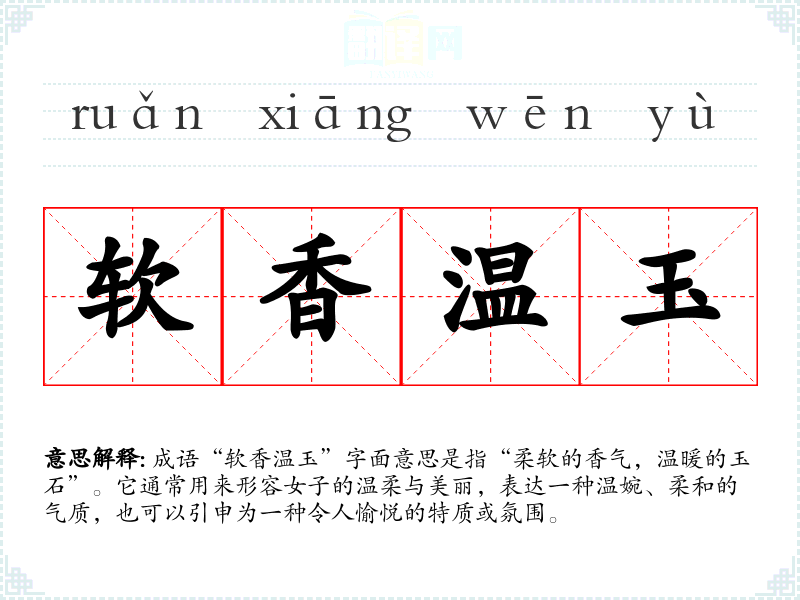 “软香温玉”出自于古代文人对美好事物的描绘,尤其是在诗歌和文学作品中。虽然成语的具体来源可能不易追溯,但可以看作是对女性美德的赞美,体现了古代社会对女性柔美气质的理想化描绘。许多古典文学作品中常用柔美的比喻来表达情感,而“软香温玉”恰好符合这种文风。