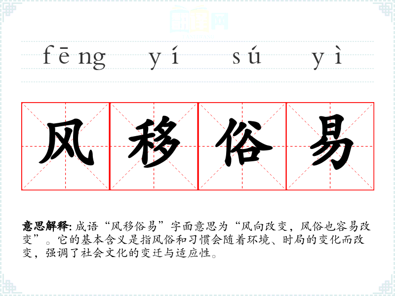 成语“风移俗易”字面意思为“风向改变,风俗也容易改变”。它的基本含义是指风俗和*惯会随着环境、时局的变化而改变,强调了社会文化的变迁与适应性。