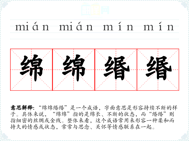 “绵绵缗缗”是一个成语,字面意思是形容持续不断的样子。具体来说,“绵绵”指的是绵长、不断的状态,而“缗缗”则指细密的丝绸或金线。整体来看,这个成语常用来形容一种柔和而持久的情感或状态,常常与思念、关怀等情感联系在一起。