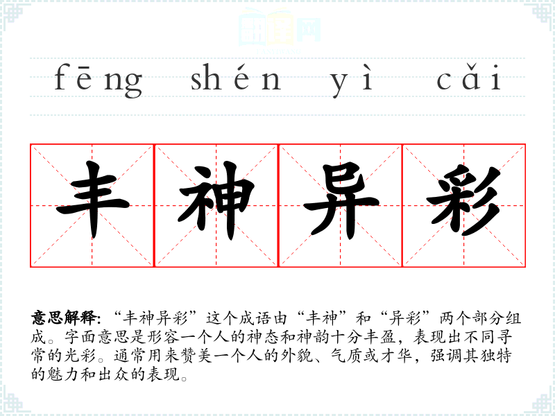 “丰神异彩”这个成语由“丰神”和“异彩”两个部分组成。字面意思是形容一个人的神态和神韵十分丰盈,表现出不同寻常的光彩。通常用来赞美一个人的外貌、气质或才华,强调其独特的魅力和出众的表现。
