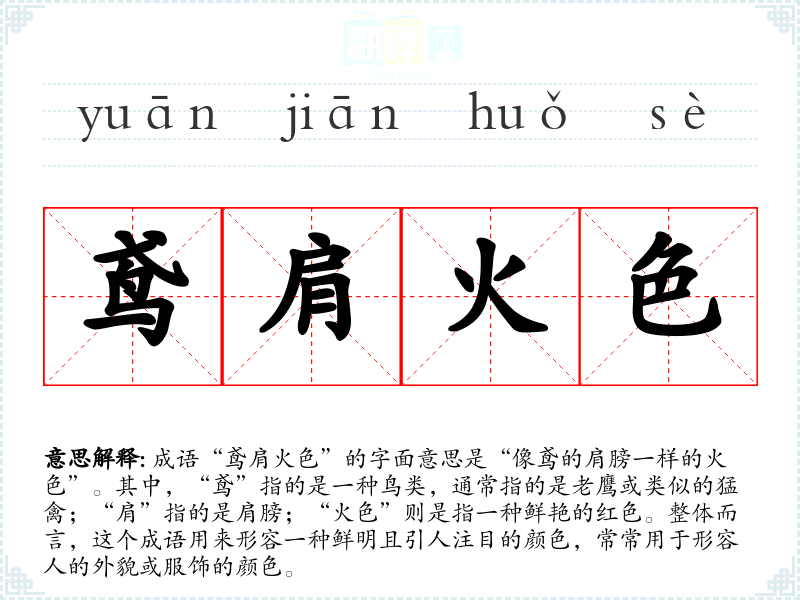 成语“鸢肩火色”的字面意思是“像鸢的肩膀一样的火色”。其中,“鸢”指的是一种鸟类,通常指的是老鹰或类似的猛禽;“肩”指的是肩膀;“火色”则是指一种鲜艳的红色。整体而言,这个成语用来形容一种鲜明且引人注目的颜色,常常用于形容人的外貌或服饰的颜色。