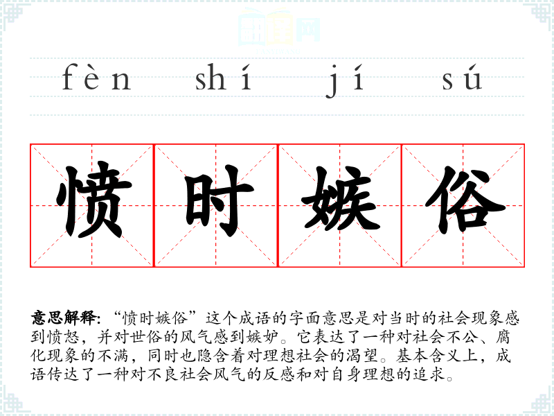 “愤时嫉俗”反映了**传统文化中对社会风气的关注,尤其是在历史上许多文人对社会现象进行批评的背景下。现代社会中,这一成语依然适用,尤其在面对社会不公和伦理缺失时,人们会借此表达对现状的不满和对理想社会的向往。