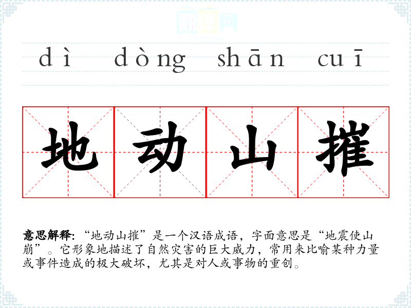 “地动山摧”出自《左传》,原文提到“地动而山摧”,形象地表现出自然力量的不可抗拒。它反映了古人对自然现象的观察和对自然力量的敬畏,同时也暗示了人类在自然面前的脆弱与无力。