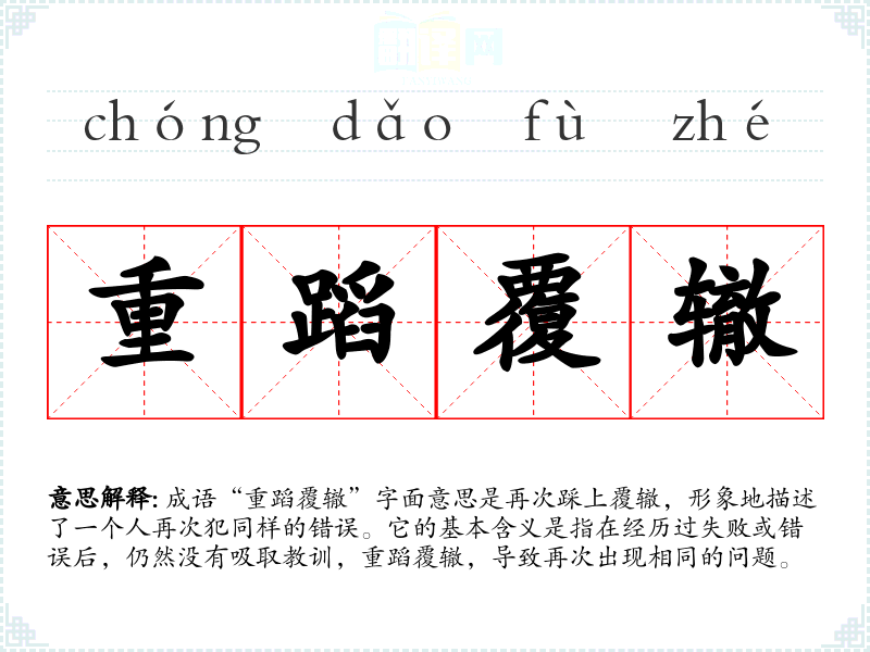 成语“重蹈覆辙”字面意思是再次踩上覆辙,形象地描述了一个人再次犯同样的错误。它的基本含义是指在经历过失败或错误后,仍然没有吸取教训,重蹈覆辙,导致再次出现相同的问题。