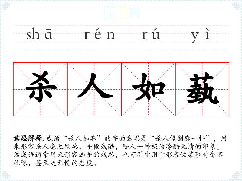 成语“杀人如麻”的字面意思是“杀人像割麻一样”,用来形容杀人毫无顾忌,手段残酷,给人一种极为冷酷无情的印象。该成语通常用来形容凶手的残忍,也可引申用于形容做某事时毫不犹豫,甚至是无情的态度。