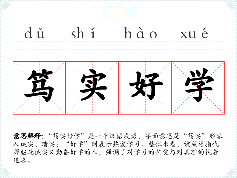 “笃实好学”是一个汉语成语,字面意思是“笃实”形容人诚实、踏实;“好学”则表示热爱学。整体来看,该成语指代那些既诚实又勤奋好学的人,强调了对学的热爱与对真理的执着追求。