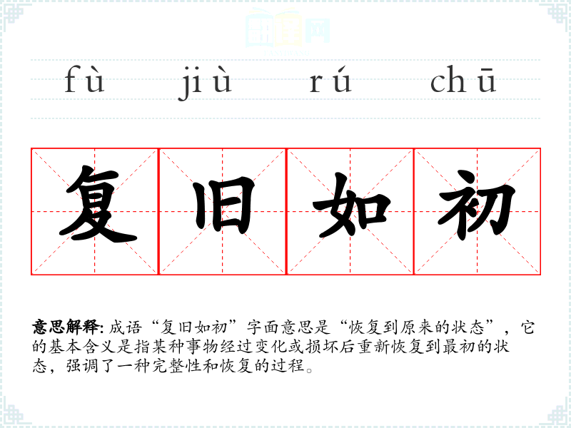 成语“复旧如初”字面意思是“恢复到原来的状态”,它的基本含义是指某种事物经过变化或损坏后重新恢复到最初的状态,强调了一种完整性和恢复的过程。