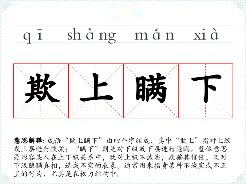 | 欺上瞒下 | 对上欺骗,博取信任;对下隐瞒,掩盖真相。 |