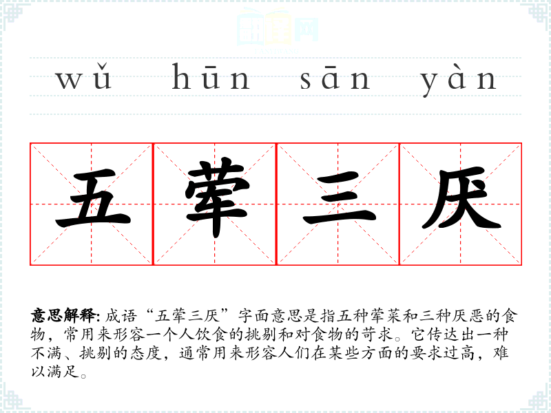 成语“五荤三厌”字面意思是指五种荤菜和三种厌恶的食物,常用来形容一个人饮食的挑剔和对食物的苛求。它传达出一种不满、挑剔的态度,通常用来形容人们在某些方面的要求过高,难以满足。