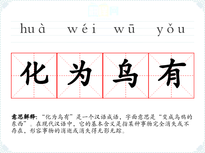 “化为乌有”是一个汉语成语,字面意思是“变成乌鸦的东西”。在现代汉语中,它的基本含义是指某种事物完全消失或不存在,形容事物的消逝或消失得无影无踪。
