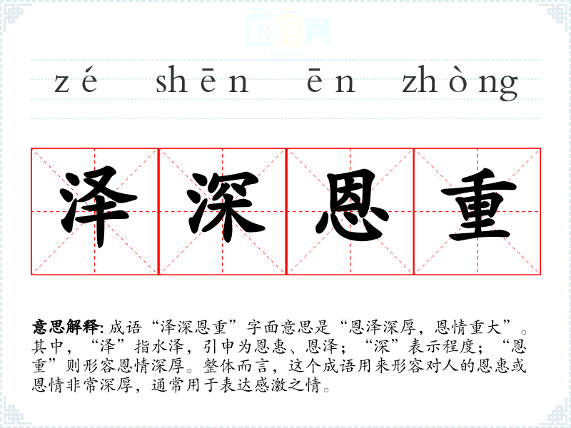 成语“泽深恩重”字面意思是“恩泽深厚,恩情重大”。其中,“泽”指水泽,引申为恩惠、恩泽;“深”表示程度;“恩重”则形容恩情深厚。整体而言,这个成语用来形容对人的恩惠或恩情非常深厚,通常用于表达感激之情。