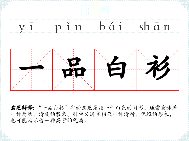 “一品白衫”并不是一个传统的成语,而是近年来在某些文学作品和网络文化中逐渐流行的词汇。其可能源于对古代文人或士人的描绘,他们常常穿着白衫,给人以清雅、脱俗的印象。
