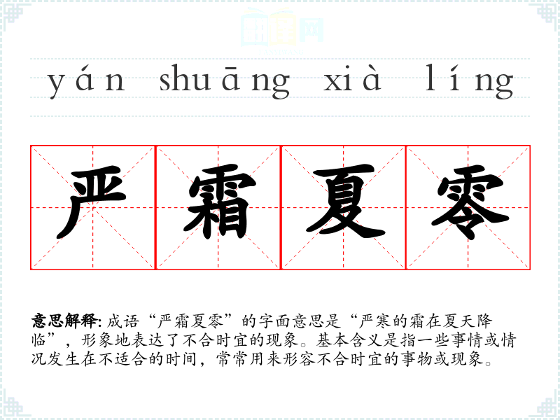 成语“严霜夏零”的字面意思是“严寒的霜在夏天降临”,形象地表达了不合时宜的现象。基本含义是指一些事情或情况发生在不适合的时间,常常用来形容不合时宜的事物或现象。