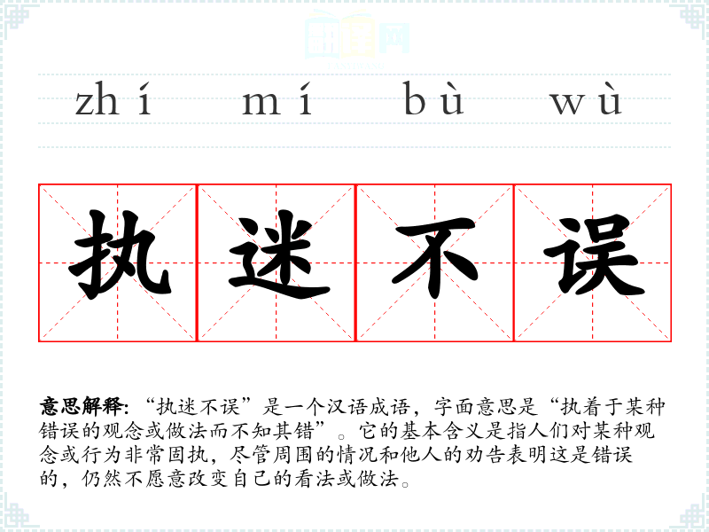 “执迷不误”是一个汉语成语,字面意思是“执着于某种错误的观念或做法而不知其错”。它的基本含义是指人们对某种观念或行为非常固执,尽管周围的情况和他人的劝告表明这是错误的,仍然不愿意改变自己的看法或做法。