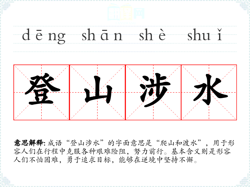 成语“登山涉水”的字面意思是“爬山和渡水”,用于形容人们在行程中克服各种艰难险阻,努力前行。基本含义则是形容人们不怕困难,勇于追求目标,能够在逆境中坚持不懈。