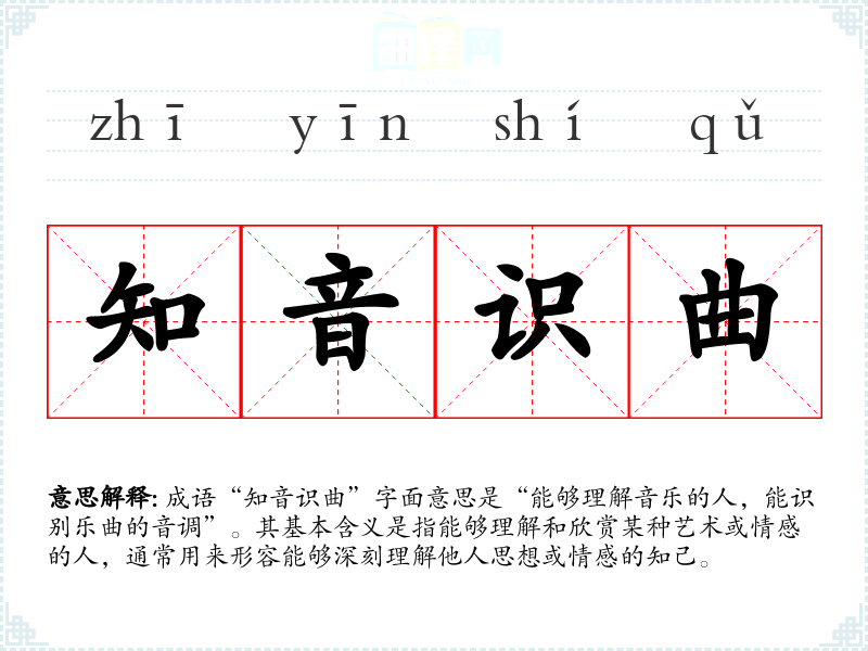 成语“知音识曲”字面意思是“能够理解音乐的人,能识别乐曲的音调”。其基本含义是指能够理解和欣赏某种艺术或情感的人,通常用来形容能够深刻理解他人思想或情感的知己。