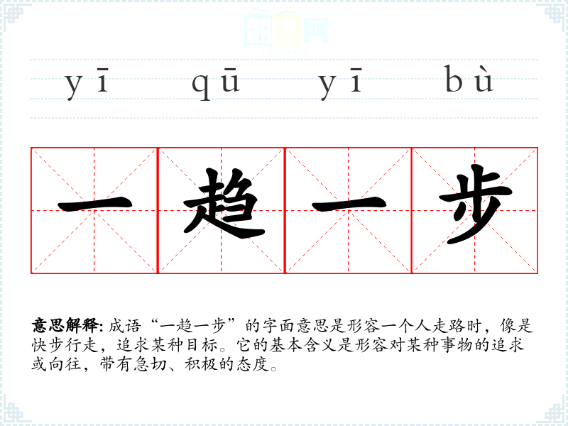 成语“一趋一步”的字面意思是形容一个人走路时,像是快步行走,追求某种目标。它的基本含义是形容对某种事物的追求或向往,带有急切、积极的态度。
